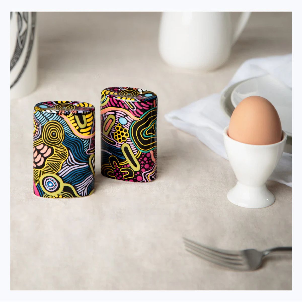 Bring some bright, Australian fun spice to their table with this pair of stunning salt and pepper shakers, featuring a design by Queensland indigenous artist, Justin Butler.