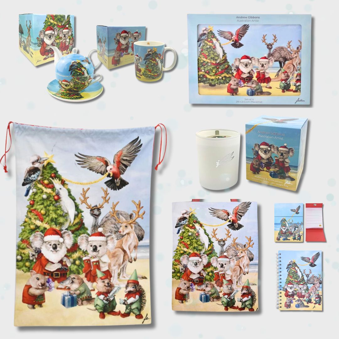 How adorable is this gift set of 8 x items from the Koala Beach Christmas collection? It includes a huge santa sack, tote bag, notebook, notepad, candle, teapot, mug and placemats for the big day. Wow!