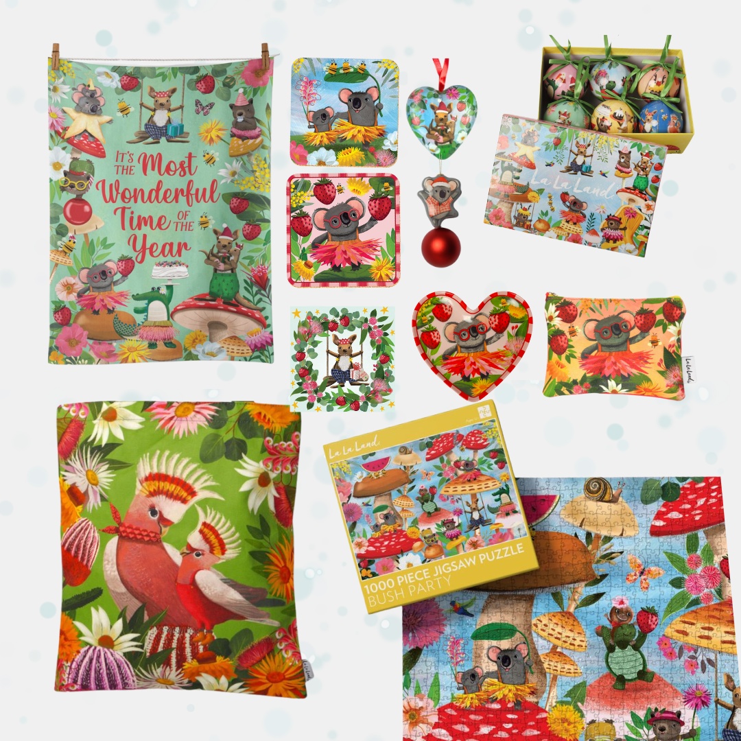 You'll get gifting sorted with this 'Bush Party' collection. The prize includes a set of Christmas baubles, 2 coasters, a jigsaw puzzle, 2 Christmas tree decorations, a luxe greeting card, a tote bag, a tea towel, a heart trinket tray, and a coin purse!
