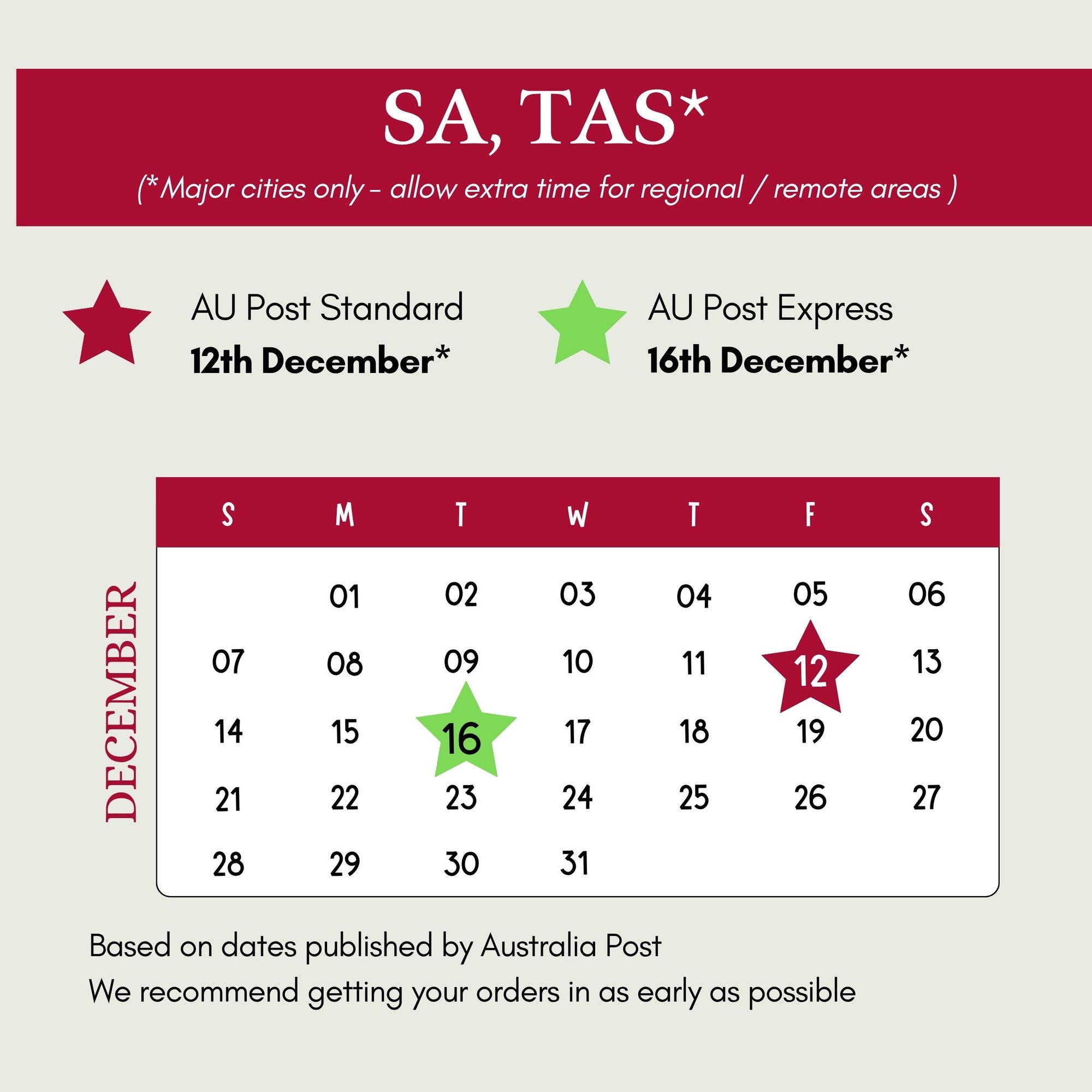 The dates below are the dates you must place your order by for delivery tometro areas only.They are based on published deadlines by Australia Post.