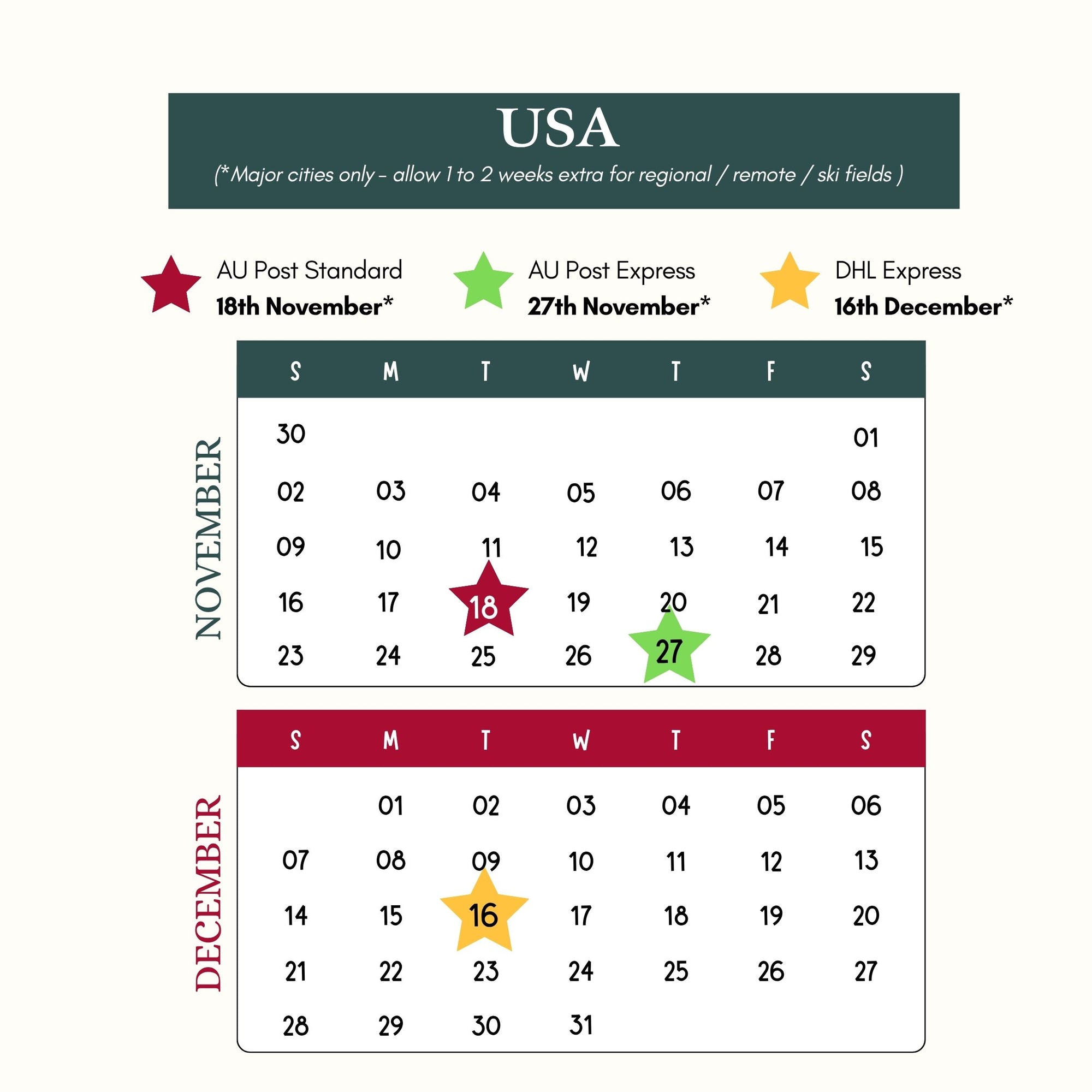 We recommend getting in early to get the best rates and avoid disappointment, as there are many things that can delay shipments like random customs checks, snow storms, delivery to remote areas, and the general volume of parcels moving through the system.
